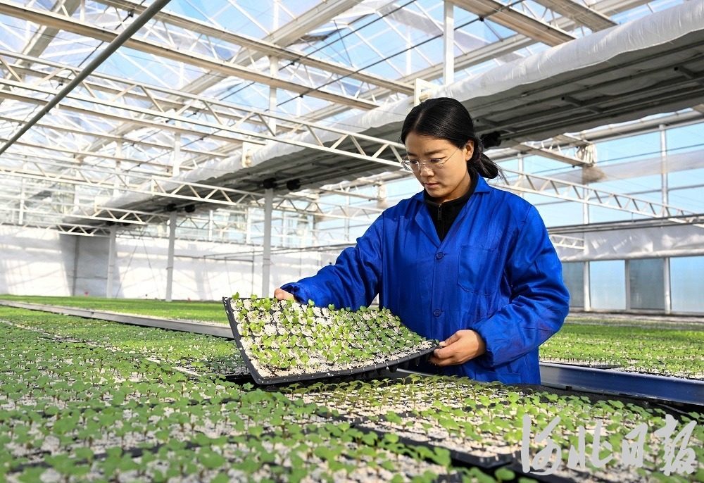 1月22日,省人大代表、肃宁县绿苑蔬菜专业合作社负责人张莎莎在检查秧苗长势。河北日报记者张昊摄