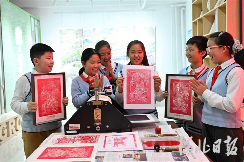 1月21日,在石家庄市柏林庄学校,学生们展示制作的腊八节主题版画。