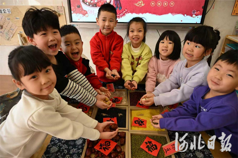 1月21日,石家庄市新华区柏林幼儿园的小朋友们参加“识五谷迎腊八”活动。