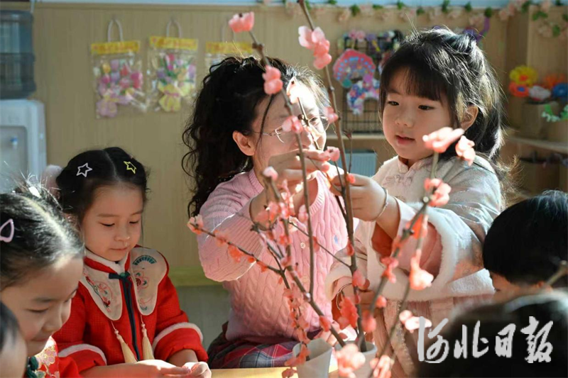 1月21日,在石家庄市华北幼儿园,老师和小朋友一起制作手工蜡梅花。
