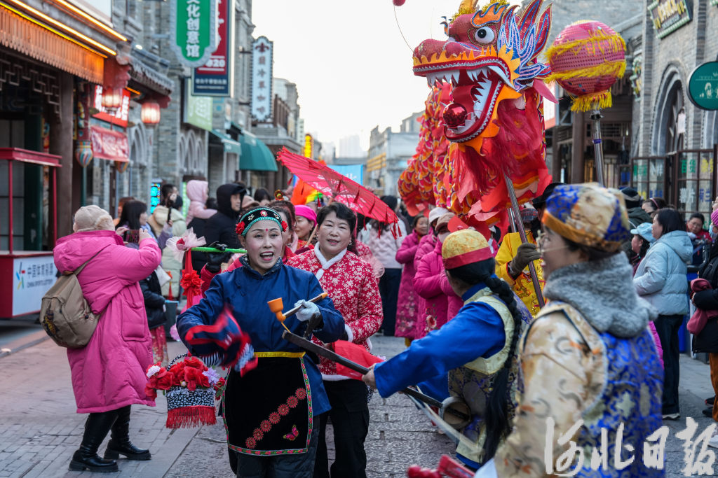 1月1日,保定西大街人头攒动,游客在这里品美食、赏非遗、看表演,欢度新年。河北日报记者 许佳奇摄
