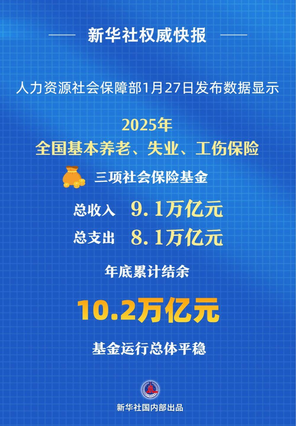 人力资源社会保障部1月27日发布数据显示,截至2025年底,全国基本养老、失业、工伤保险参保人数分别为10.76亿人、2.49亿人、3.05亿人,分别比上年底增加316万人、329万人、102万人。全年三项社会保险基金总收入9.1万亿元、总支出8.1万亿元,年底累计结余10.2万亿元,基金运行总体平稳。