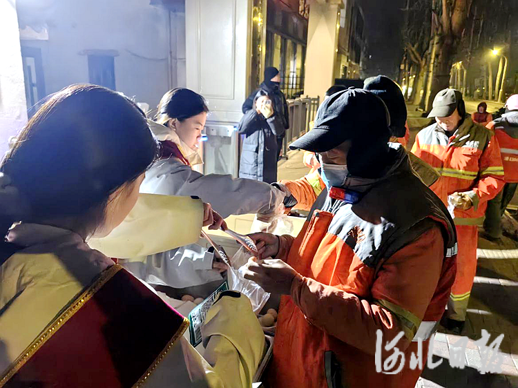 1月24日,石家庄市新华区北苑街道总工会联合石家庄市新华区成达文化艺术培训学校,在天翼路早餐驿站开展腊八节爱心早餐发放活动,为辖区环卫工人们送上了腊八粥、包子、茶叶蛋等早餐礼袋。