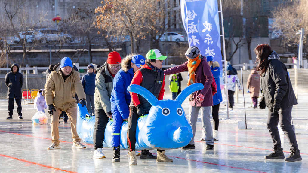 冰上疯狂毛毛虫赛道上,队员们齐声喊着号子,手脚协同发力,充气毛毛虫道具在冰面同步前行,整齐的步伐与观众的加油声交织;雪上拔河赛区,选手们紧握绳索、重心后移,鞋底与冰面的摩擦声中尽显团队韧劲,将现场气氛推向高潮;混合滑冰车项目中,同事搭档默契配合,亲子组合温馨互动,冰车划过冰面的“嘎吱”声里,满是欢笑与惬意……