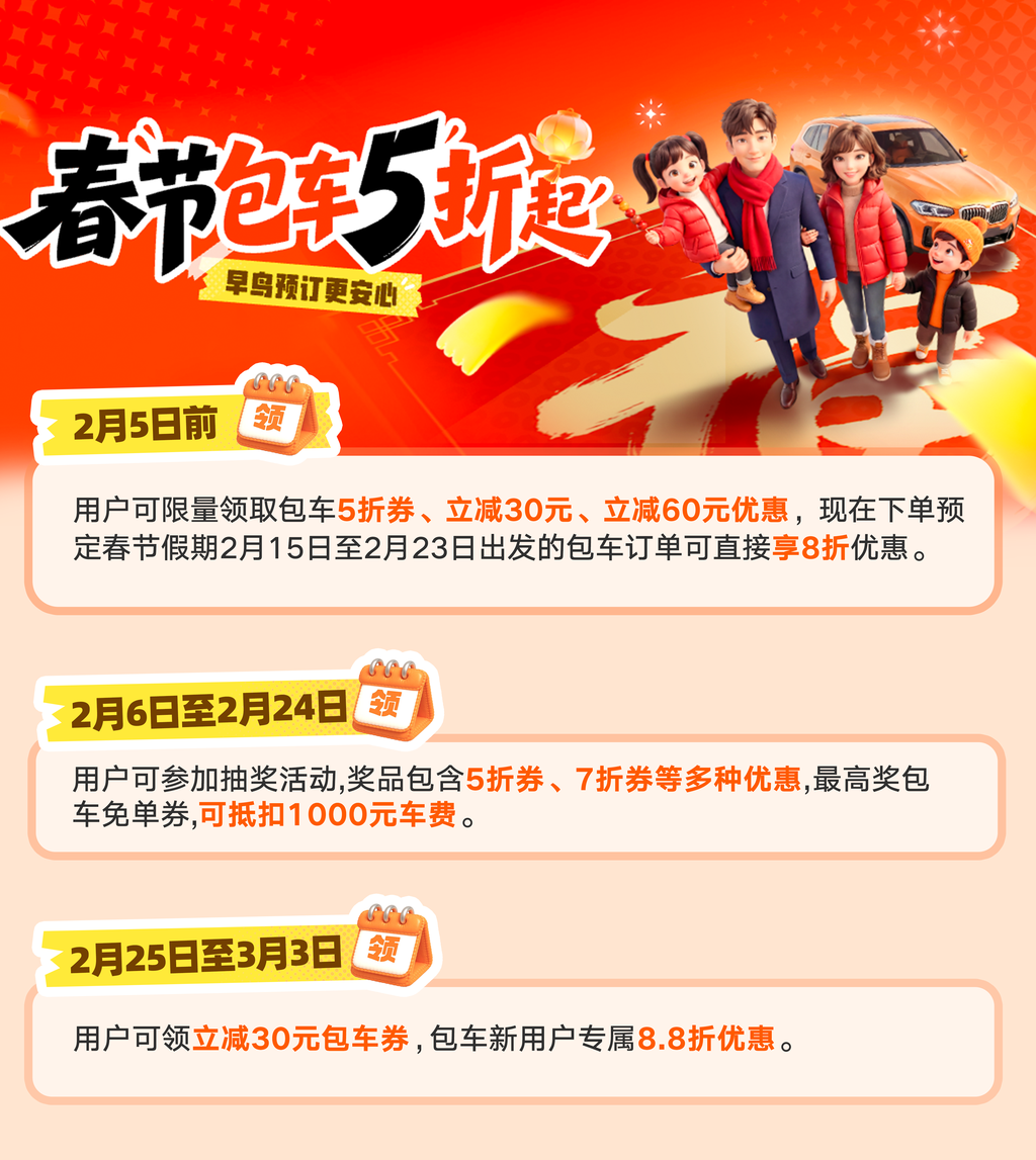 为回馈广大用户的支持和喜爱,滴滴包车推出超长周期的春节优惠活动。2月5日前,用户进入滴滴包车春节活动专属页面,可限量领取包车5折券、立减30元、立减60元优惠,现在下单预定春节假期2月15日至2月23日出发的包车订单可直接享8折优惠,提前订车出行更安心;2月6日至2月24日,用户可参加抽奖活动,奖品包含5折券、7折券等多种优惠,最高奖包车免单券,可抵扣1000元车费;元宵节期间,在2月25日至3月3日,领立减30元包车券,实惠出发。活动期间还有包车新用户专属8.8折优惠,多重礼遇陪您过大年!
