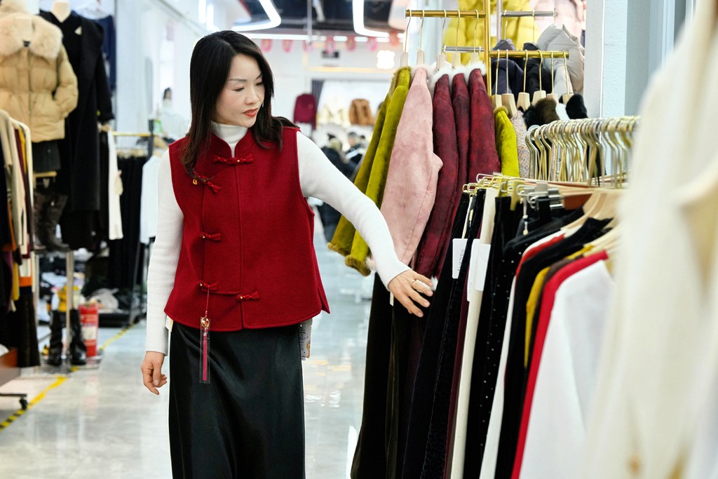 1月15日,顾客在永清县云裳小镇选购服装。