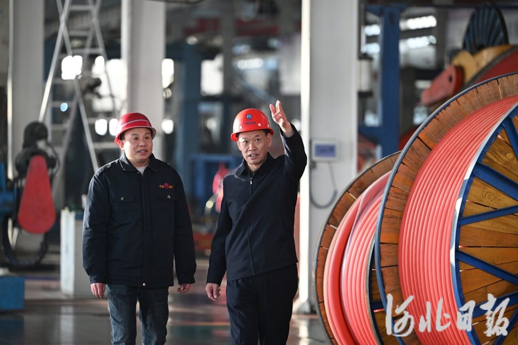 1月15日,宁小五(右)在宁联电缆集团生产车间了解企业经营情况。河北日报记者赵永辉摄