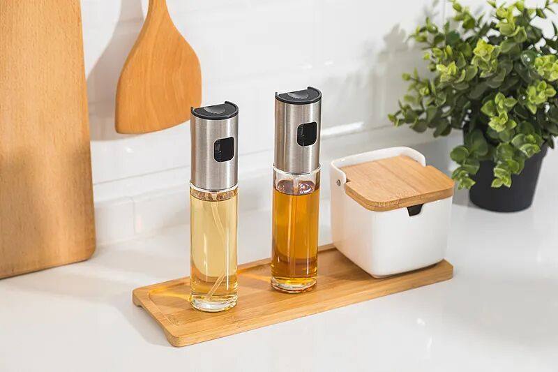 如果觉得用瓷勺或油壶很难控制量,少油烹饪或者凉拌时,也可以选择喷雾式油壶,定量精准,按压一次大约是2~3毫升,不容易过量。