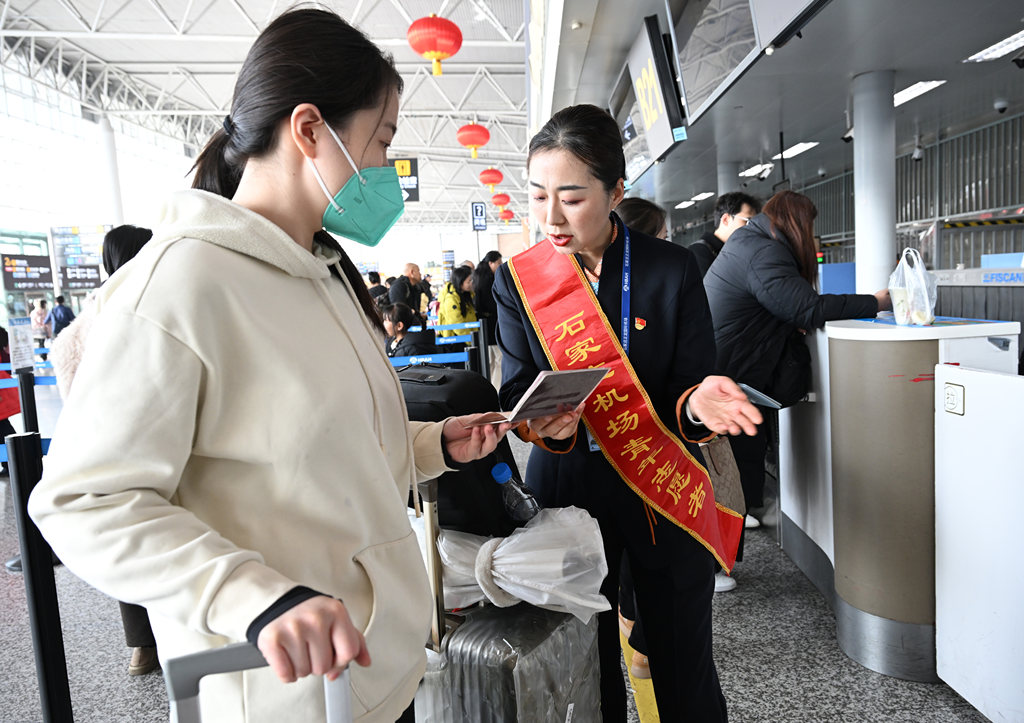 2月1日,石家庄正定国际机场工作人员为旅客办理乘机手续。