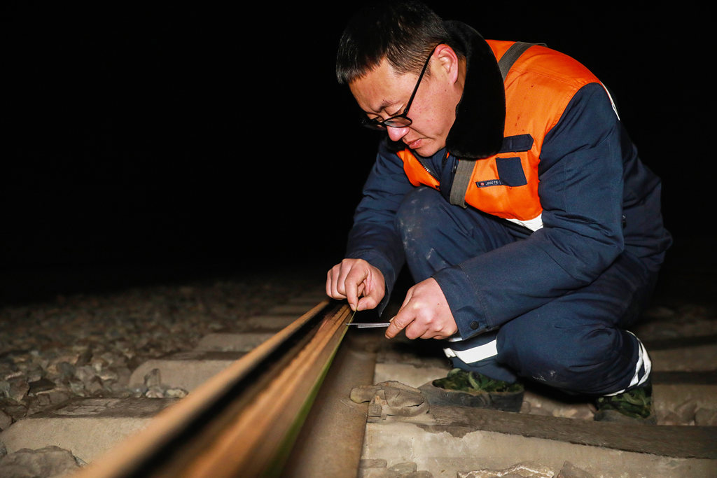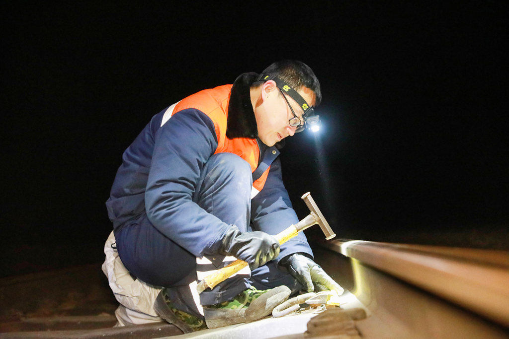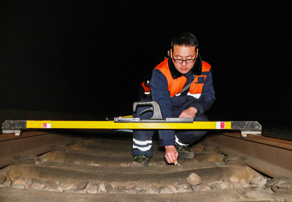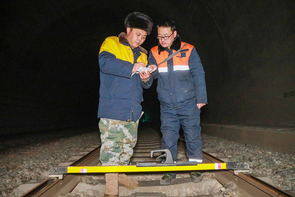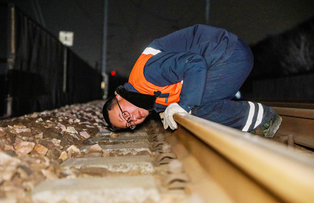 2月1日凌晨,中国铁路北京局集团有限公司石家庄工务段工作人员在石太铁路客运专线进行安检作业。