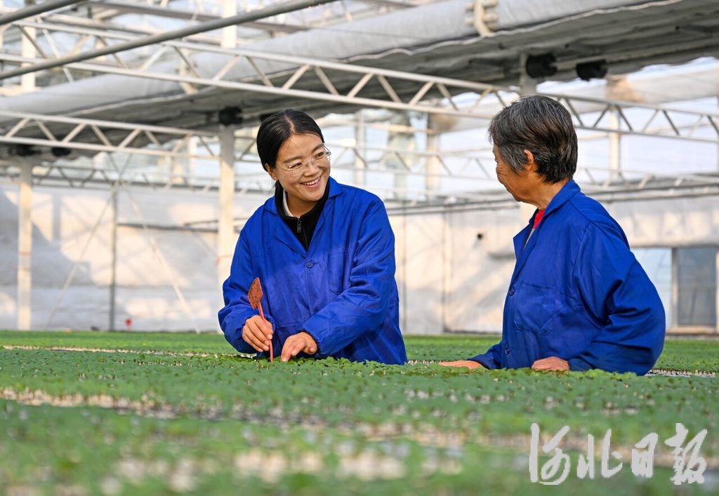 1月22日,张莎莎(左)在肃宁县绿苑蔬菜专业合作社育苗棚向农户介绍育苗经验。河北日报记者张昊摄