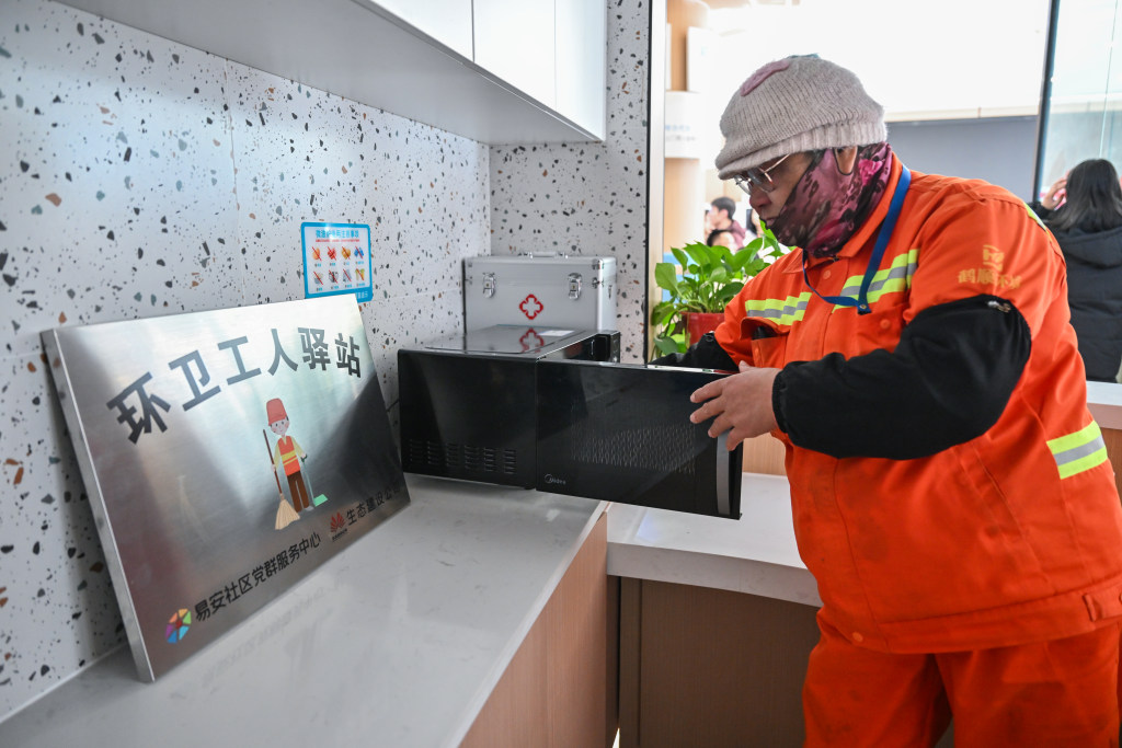 2月2日,环卫工人在易安社区党群服务中心的环卫工人驿站热饭、休息。