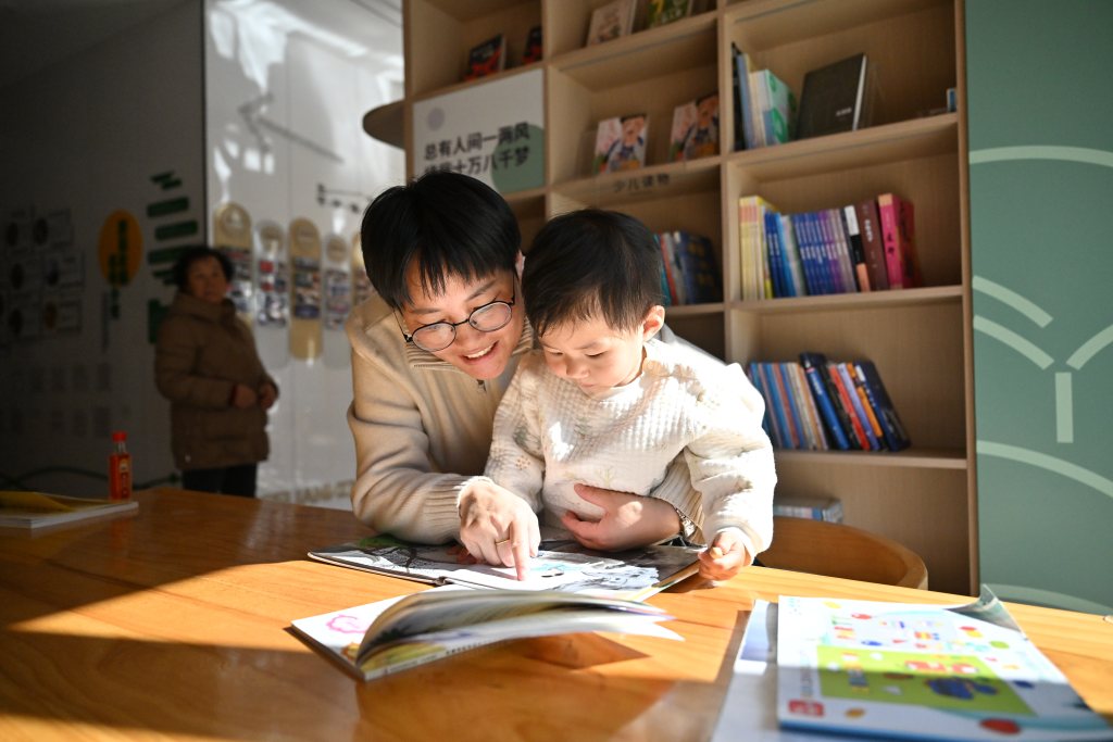 2月2日,一对母女在易安社区党群服务中心图书阅览区内看书。