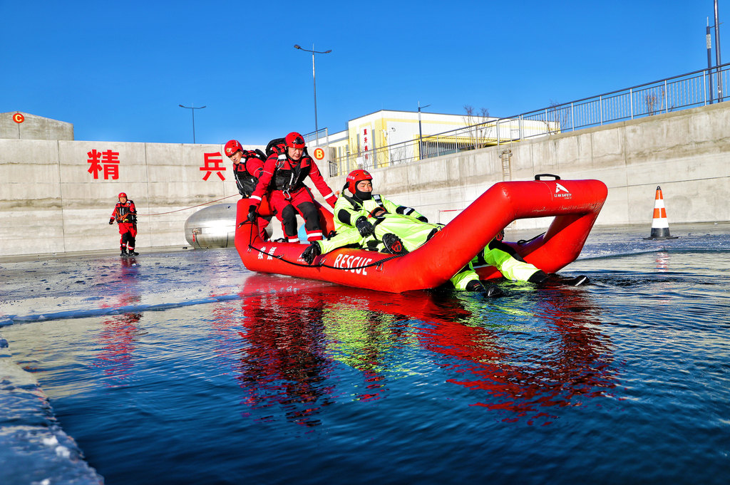 训练现场寒风凛冽,气温低至零下15摄氏度,坚硬的冰层与刺骨的冰水构成了极具挑战性的实战环境。训练紧密围绕冬季冰域救援的核心需求,模拟人员意外落水的真实场景,重点演练冰面侦察、安全破冰、快速接近、救生筏投放、落水人员固定、协同转运等多个关键科目。