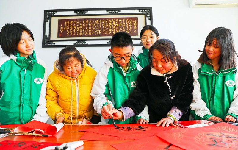 2月2日,张家口市第七中学学生在教村民写春联、写福字。