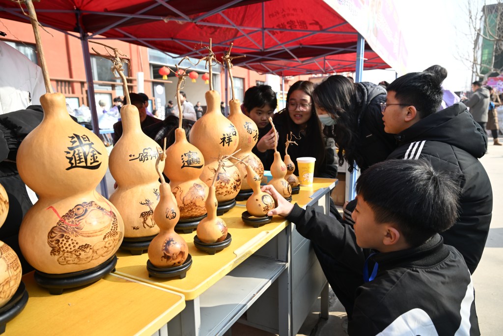 2月3日,宁晋县北新教育集团学生在观赏葫芦烙画。