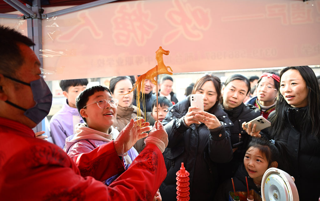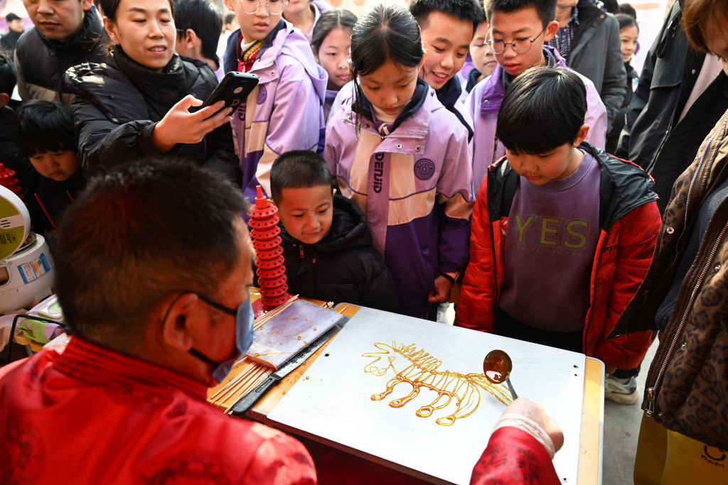 2月3日,宁晋县北新教育集团学生在观赏民间艺人展示的糖画制作技艺。