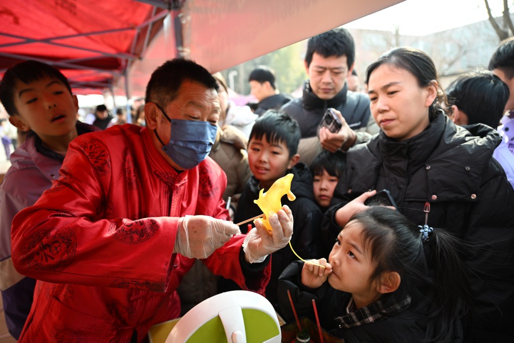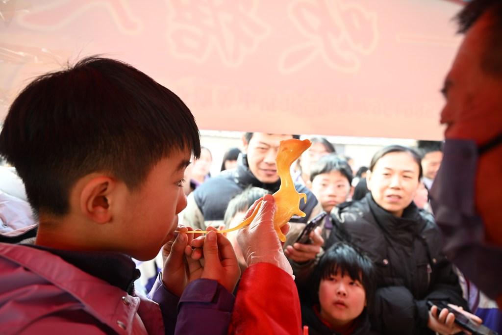2月3日,宁晋县北新教育集团师生在观赏民间艺人吹制的糖人。