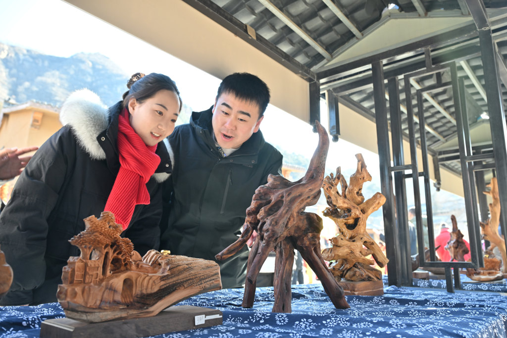 2月3日,游客在骆驼湾特色市集选购工艺品。