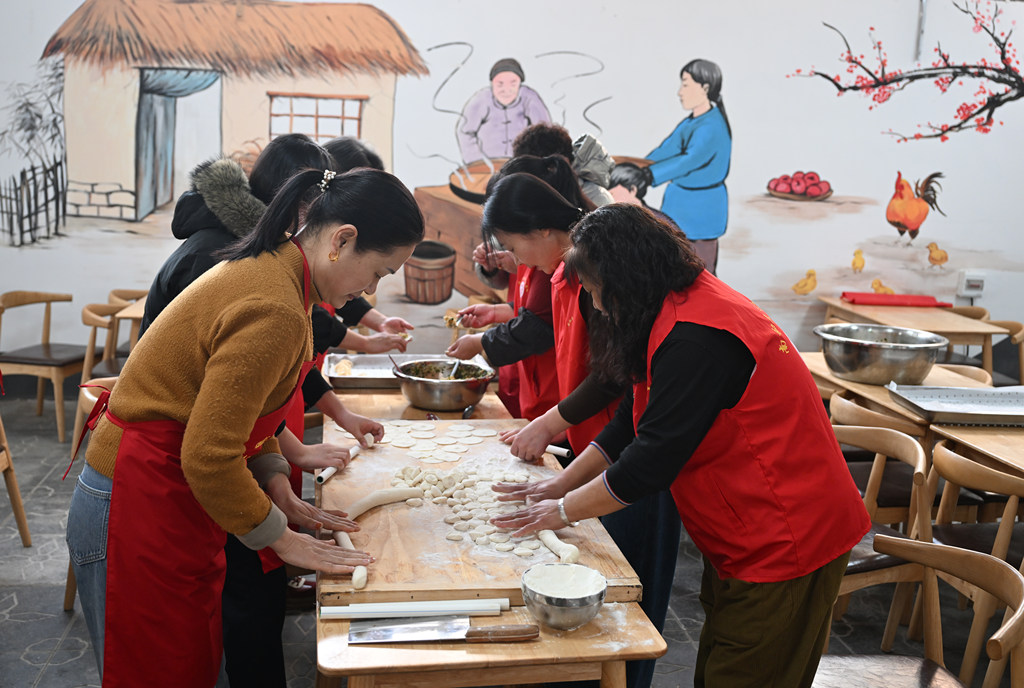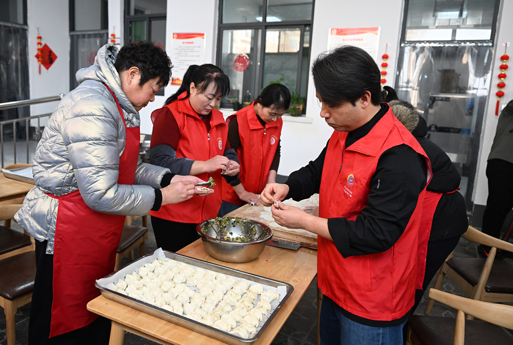 2月4日,邢台市南和区志愿者在左李召村幸福互助院为老人包饺子。