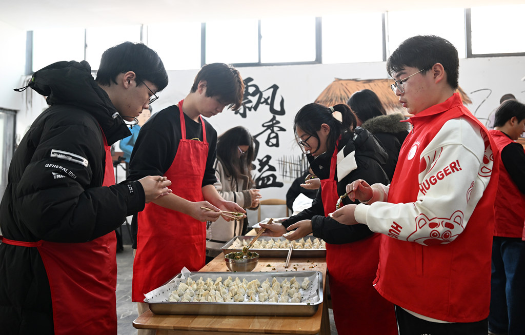2月4日,邢台市南和区寒假回乡大学生志愿者在左李召村幸福互助院为老人包饺子。