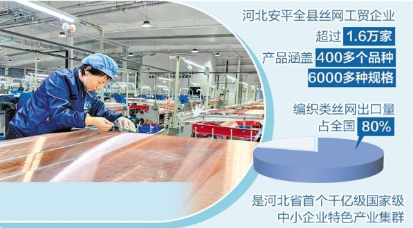 河北安平有“中国丝网之都”之称,全县丝网工贸企业超过1.6万家,产品涵盖400多个品种6000多种规格,编织类丝网出口量占全国80%,是河北省首个千亿级国家级中小企业特色产业集群。然而,龙头企业少、设备智能化水平低、同质化竞争严重等大而不强的问题也曾困扰这里。