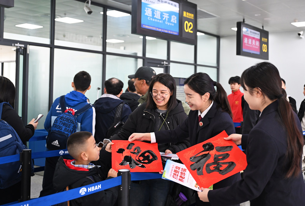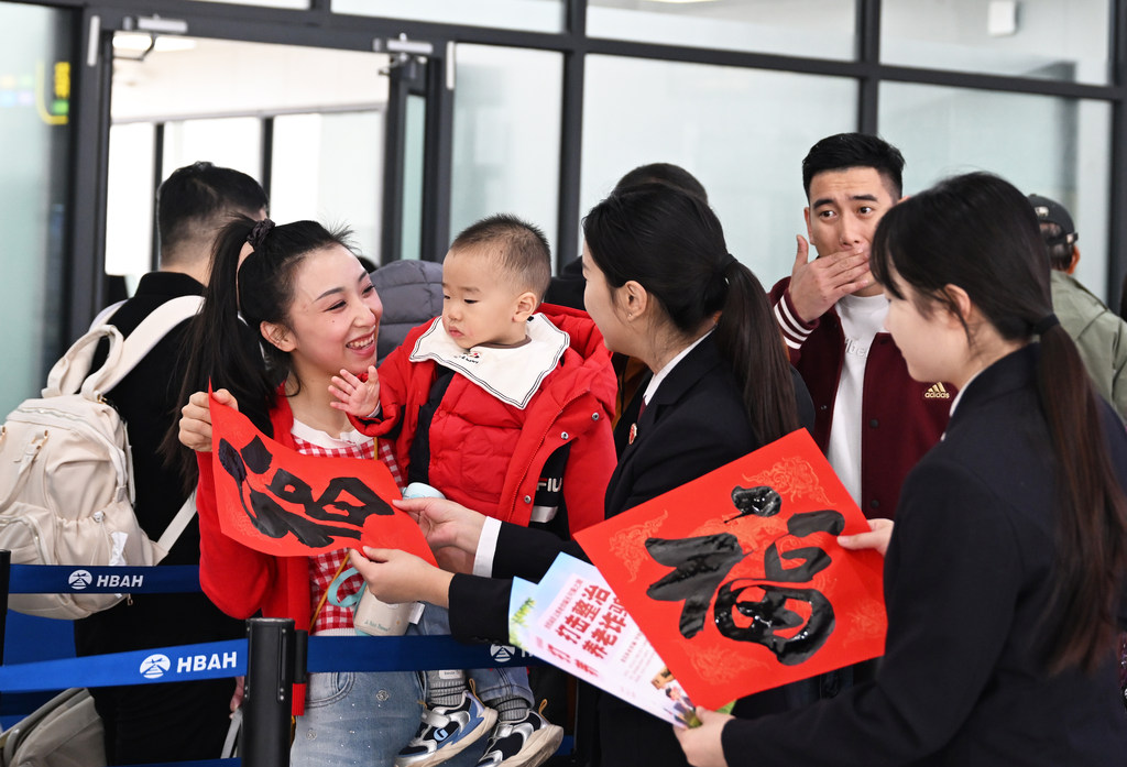 2月5日,在邢台褡裢机场航站楼,沙河市人民检察院干警为旅客赠送福字和普法宣传资料。