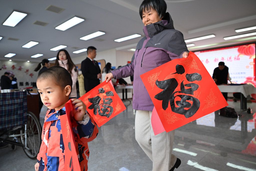 2月5日,在沙河市田安社区活动中心,居民高兴地领到福字。