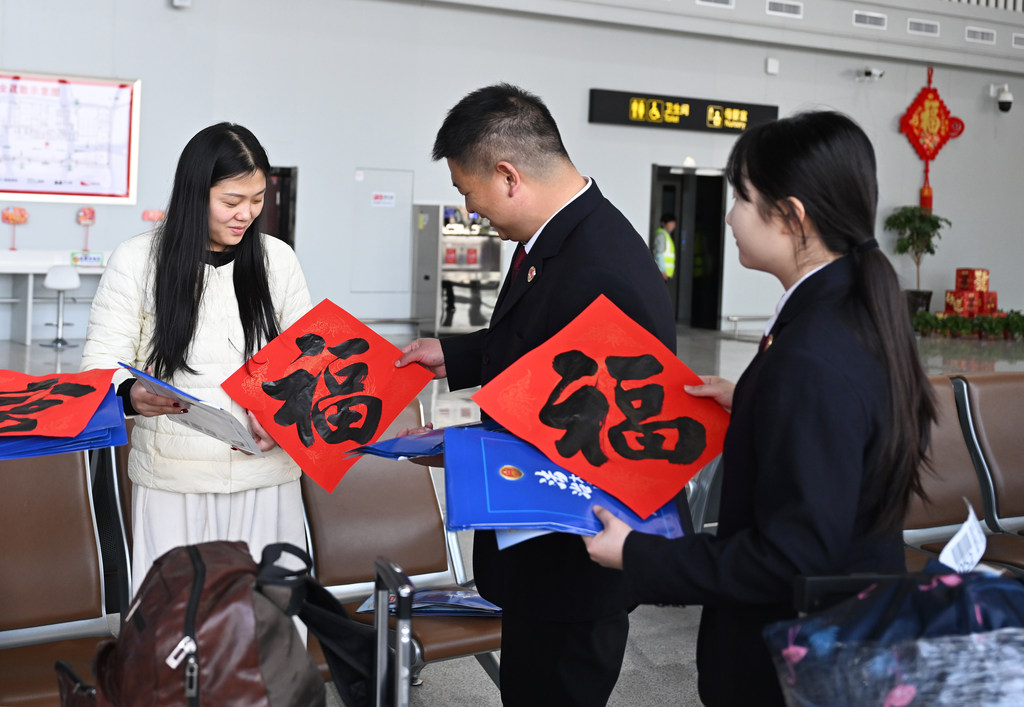 2月5日,沙河市人民检察院干警为旅客赠送法治大礼包和福字。