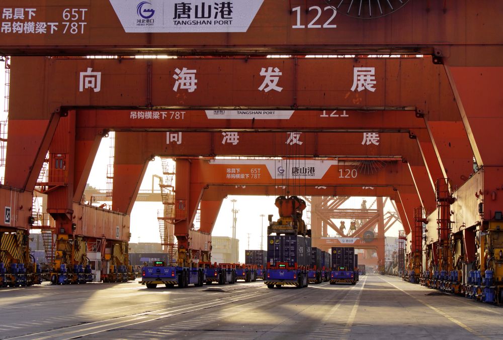 2月5日,唐山港京唐港区的无人运输车在集装箱码头作业。