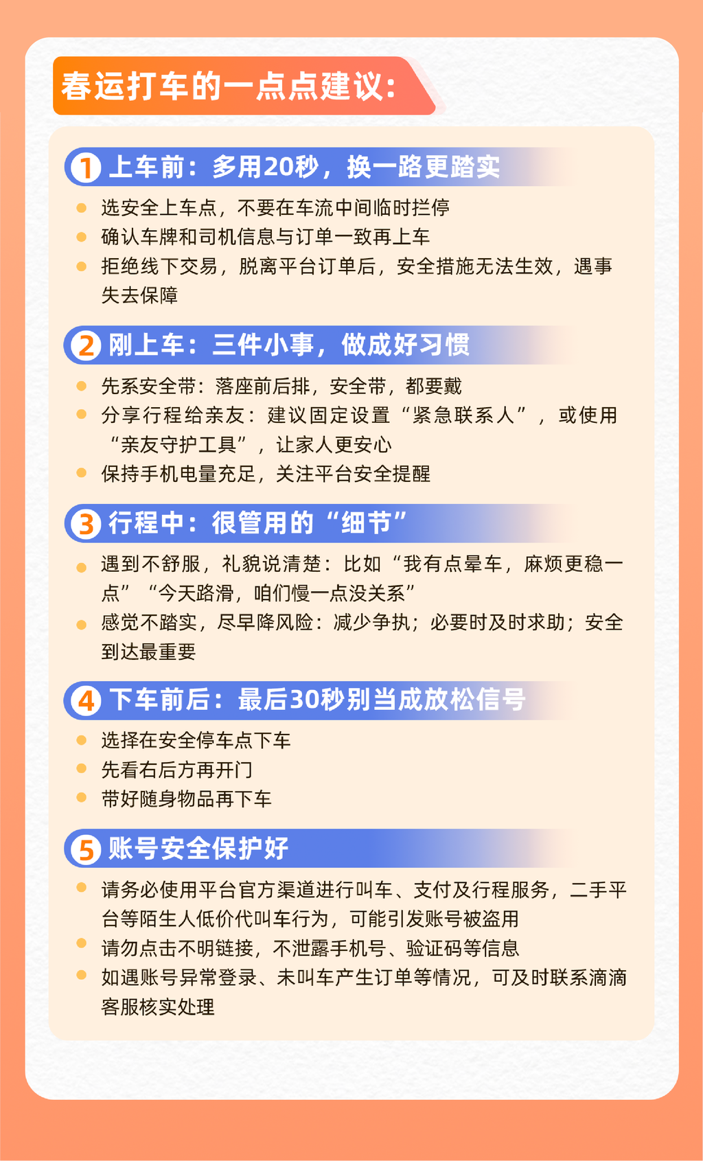 春运路上,多一分确认、少一点侥幸,就能减少很多不必要的风险。滴滴会持续做好春运安全与服务保障,祝愿大家每一次出发都顺顺当当,每一次抵达都平平安安。