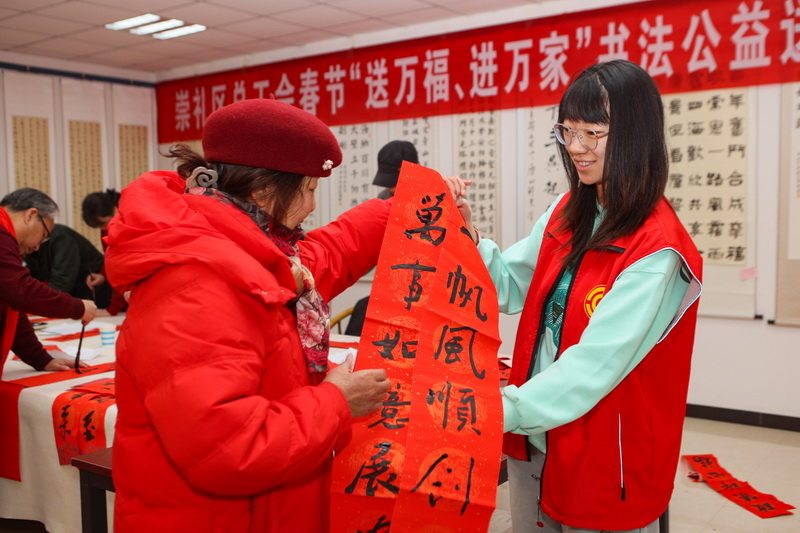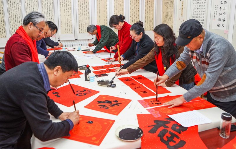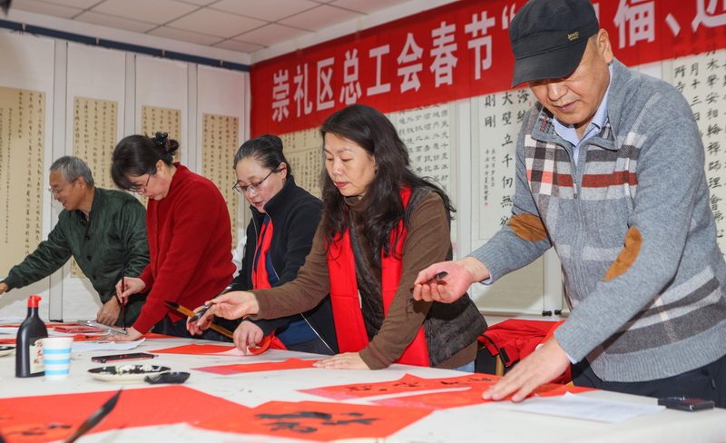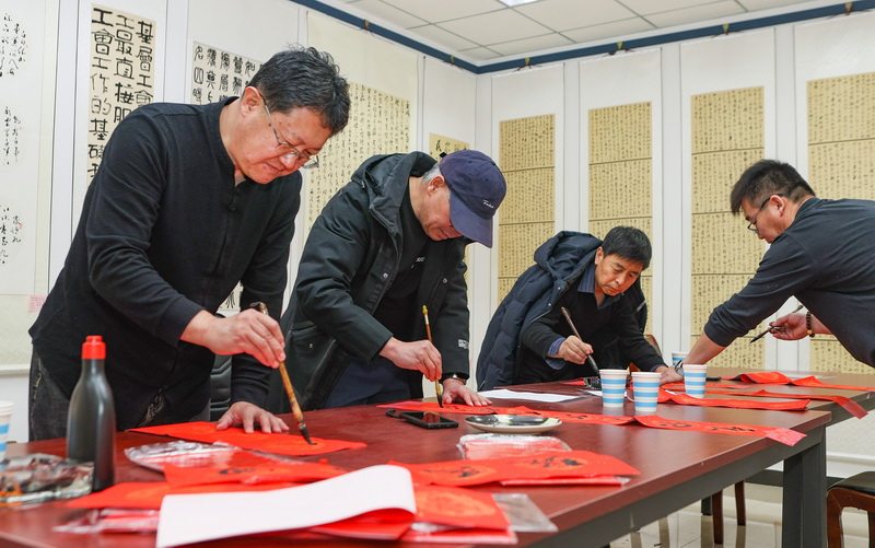 2月7日,张家口市崇礼区书法家协会会员在书写春联。