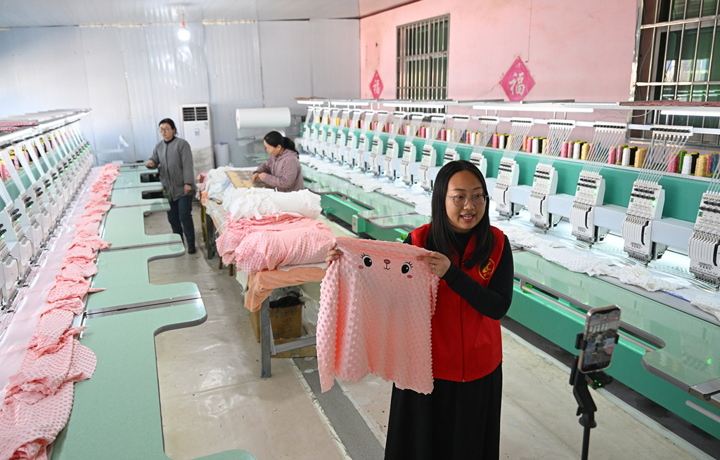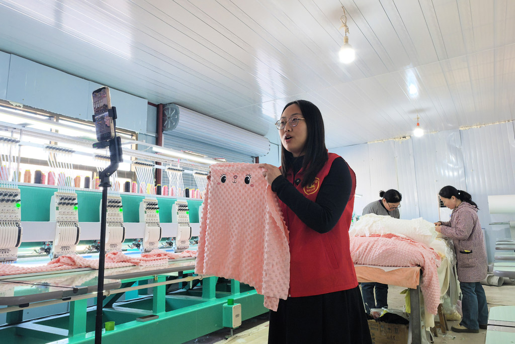 2月7日,临城县鸭鸽营乡干部侯雅茜在辛安庄村保花玩具厂车间直播。