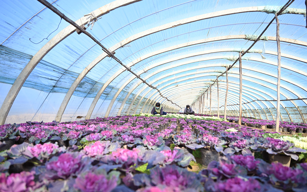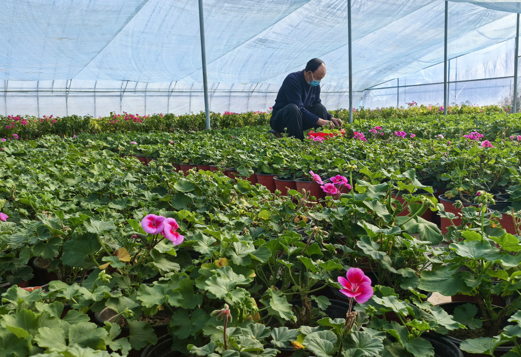 2月4日,花农在邢台市南和区和阳镇花卉种植基地大棚管护花卉。