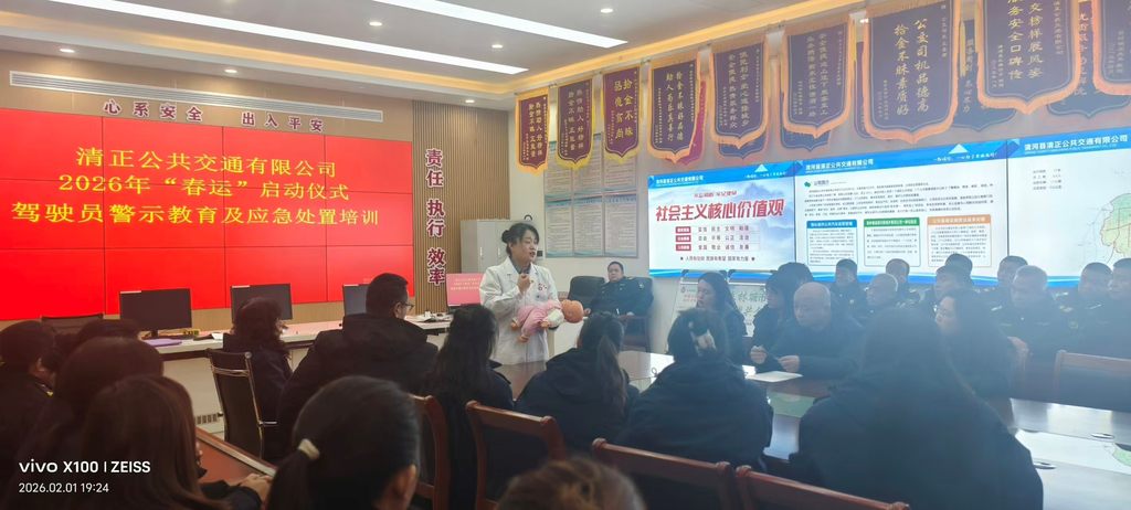 活动传达了上级关于春运保障工作的通知要求,通报了本县春运期间客流量预判情况及安全防控重点;公安交管部门结合真实案例,生动宣讲了春运期间交通安全注意事项。中国人寿财险清河县支公司负责人介绍了专门为春运定制的保险服务方案,涵盖旅客意外险等多种保障,为出行提供全方位风险防护。医疗团队则针对春运途中常见突发状况,开展应急救治专项培训,现场演示心肺复苏等操作技能并解答疑问。最后,公交公司郑重承诺将严格落实安全生产主体责任,持续加强驾驶员安全教育培训与车辆运维保障,全力为人民群众提供安全、优质、高效的客运服务。
