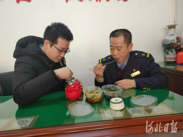 1月30日,除夕前一天。中午11时许,中国铁路北京局集团有限公司石家庄客运段石杭车队学习室内,一对父子提前在吃着“年夜饭”。