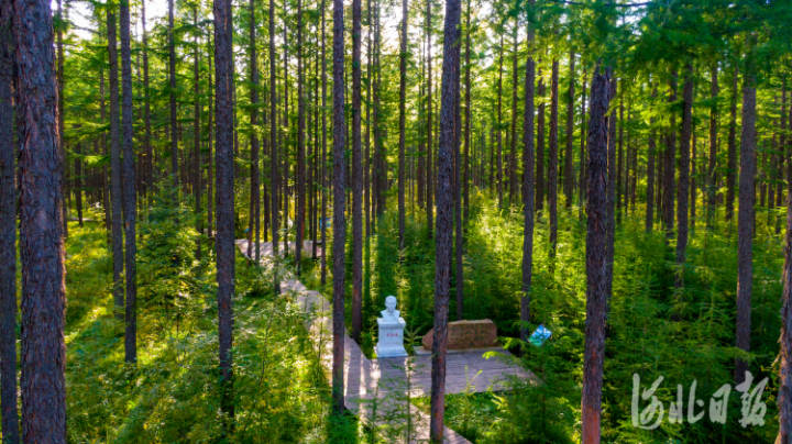 尚海纪念林位于塞罕坝机械林场原马蹄坑造林会战区,一棵棵近30米高的落叶松针叶苍翠、刚劲挺拔。