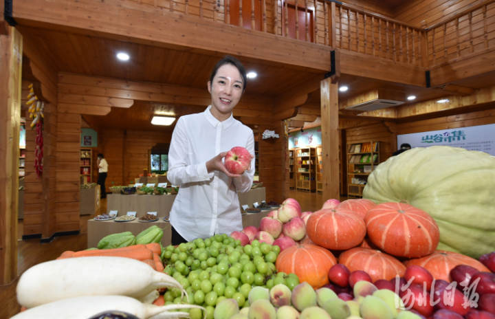 8月24日,大贵口村第一书记郝天娇在山谷市集向记者讲述习近平总书记到展厅考察时的情景。河北日报记者 赵海江摄