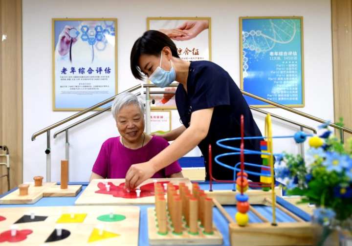在石家庄市桥西区振头街道普爱养老照护中心,照护人员帮助老人做康复训练。 新华社记者王晓摄