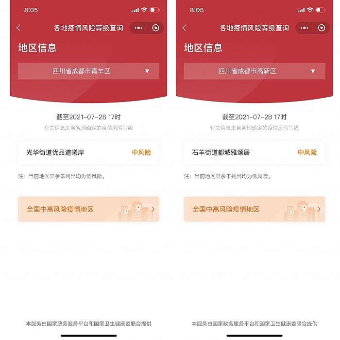 据国家政务服务小程序消息,截止至2021年7月28日17时,成都两地升级为中风险地区,分别是:青羊区光华街道优品道曦岸和高新区石羊街道都城雅颂居。