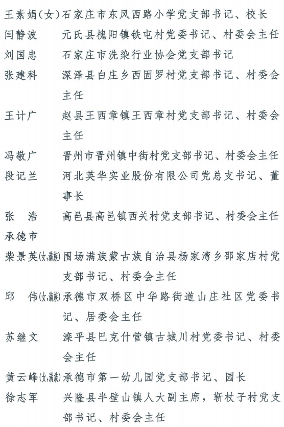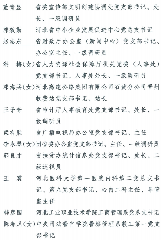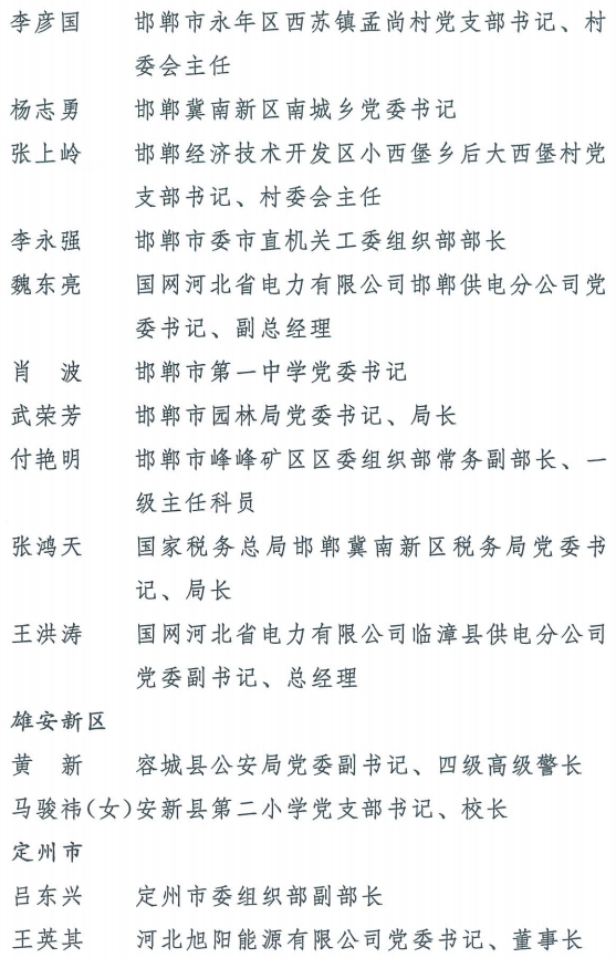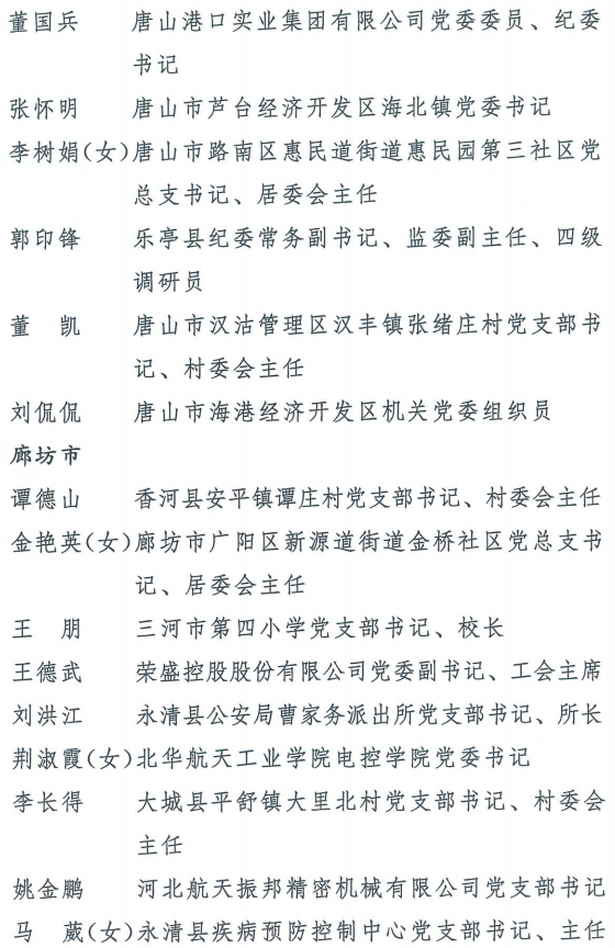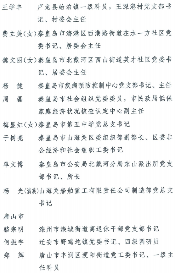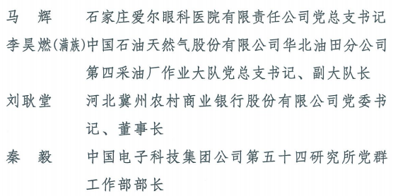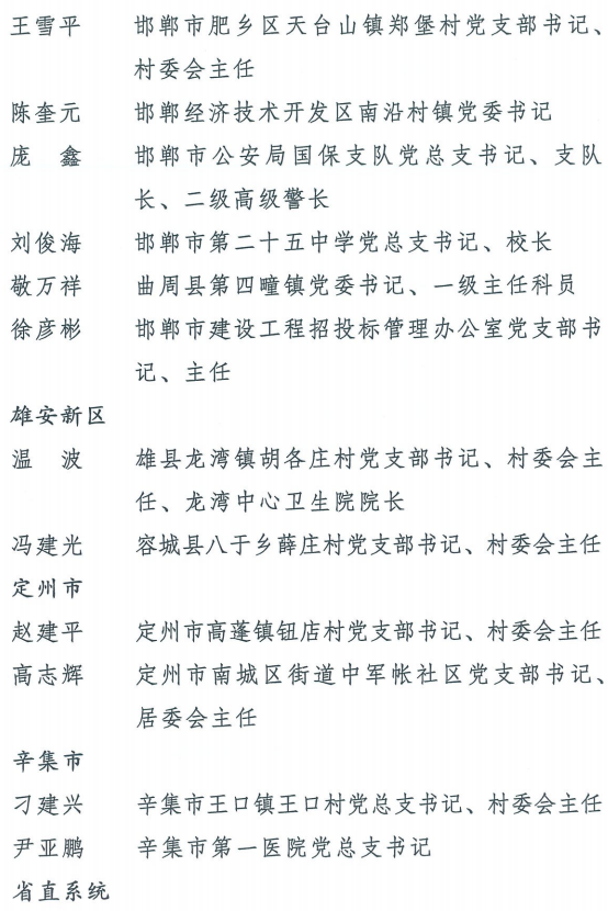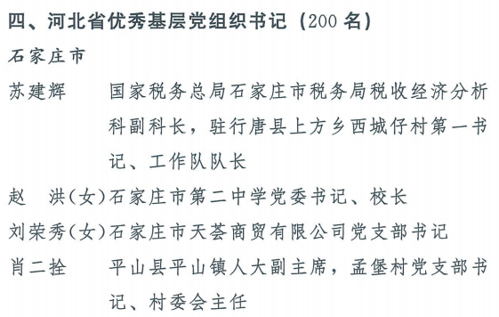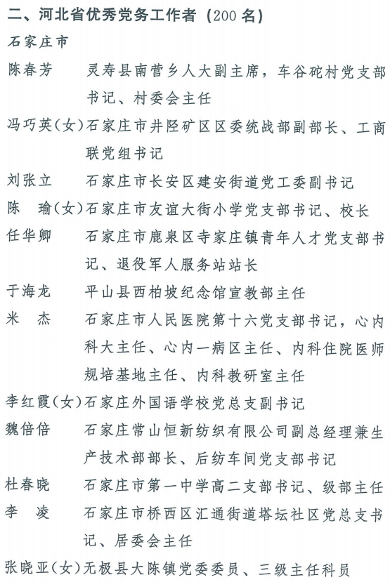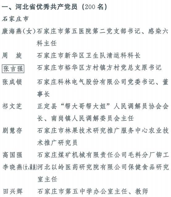 伟大时代呼唤伟大精神,崇高事业需要榜样引领。在庆祝中国共产党成立100周年的重大时刻,在“两个一百年”历史交汇的关键节点,为了表彰先进、弘扬正气,激励全省各级党组织和广大党员干部奋发作为、建功立业,省委决定,授予王红心等199名同志、追授张吉强同志“河北省优秀共产党员”称号,授予闫忠生等200名同志“河北省优秀党务工作者”称号,授予辛集市辛集镇党委等400个基层党组织“河北省先进基层党组织”称号,授予陈林静等200名同志“河北省优秀基层党组织书记”称号。他们的先进事迹和崇高精神,鲜明昭示了党的崇高理想、坚定信念、根本宗旨和无私奉献,继承发扬了党的红色基因、光荣传统、优良作风,生动彰显了新时代共产党人的政治品格和先锋形象。