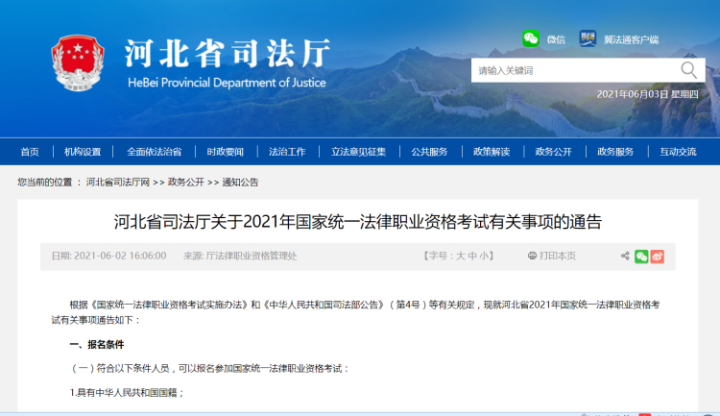 河北日报讯(记者高珊)6月2日,河北省司法厅发布了《关于2021年国家统一法律职业资格考试有关事项的公告》。公告在司法部第4号公告的基础上,结合河北省实际,进一步明确了报名条件、考区考点设置、考试费用以及我省放宽条件地区等事项,明确客观题考试网上报名时间为6月10日至6月24日,考试时间为9月11日、12日,主观题考试时间为10月17日。