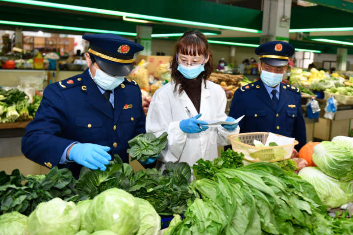 2021年2月5日,浙江湖州吴兴区市场监督管理局八里店所组织工作人员走访市场,开展食品安全检查专项行动,切实保障群众“舌尖上的安全”。新华社记者 黄宗治 摄
