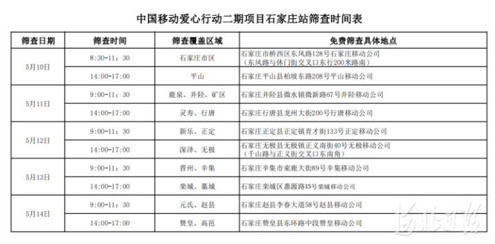 河北日报讯(记者高珊 通讯员赵洁)从河北省慈善总会获悉,5月10日—14日,由中国移动慈善基金会出资捐赠,河北省民政厅、河北省慈善总会、天津泰达国际心血管病医院合作实施的河北移动爱“心”行动——贫困先心病儿童救助项目计划,将在石家庄各县(市)区组织义诊活动。届时,符合条件的贫困家庭可以就近前往各县(市)区指定地点参加筛查。