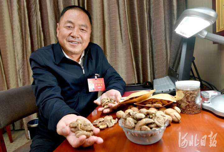 党的二十大代表、保定市阜平县龙泉关镇骆驼湾村党支部书记顾瑞利向记者展示骆驼湾村产出的香菇。河北日报记者赵海江摄
