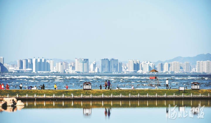 秦皇岛市北戴河区鸽子窝公园,游客正在碧海蓝天中游玩。秦皇岛持续改善海水水质,打造“水清、滩净、湾美”的优质海岸带。河北日报记者赵杰摄