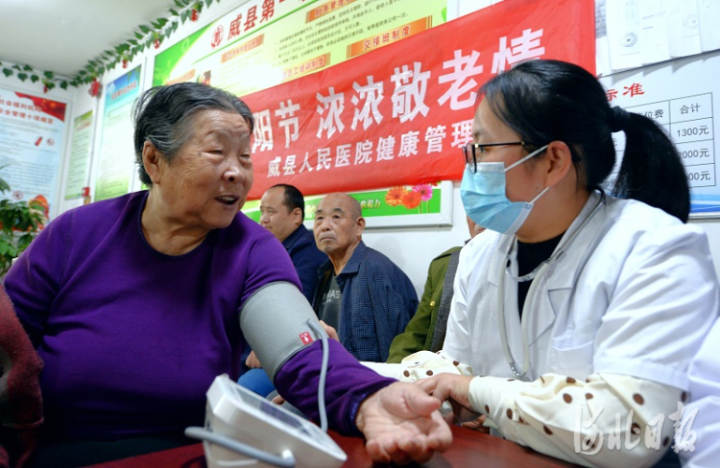 志愿者为威县第一敬老院老人免费测量血压。(河北日报资料片)河北日报记者杜柏桦摄