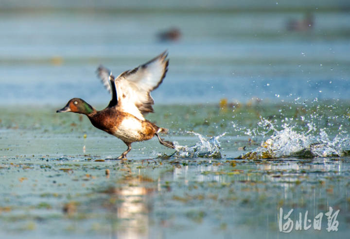 在白洋淀水域,国家一级保护动物青头潜鸭在水面上嬉戏。 河北日报记者李东宇摄