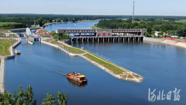 2022年6月24日,北京通州游船通过杨洼闸,驶入河北廊坊香河段。当日,京冀北运河旅游航道实现互联互通。 河北日报记者田明摄