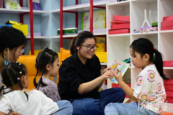 10月1日,在衡水市桃城区桥东社区“益童乐园”活动室,刘国英(中)带着小朋友们做游戏。河北日报记者焦磊摄
